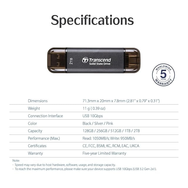 [転送速度] : 読出し (最大) 1050 MB/s ・ 書込み (最大) 950 MB/s 転送速度はホストのハードウェア、ソフトウェア、使用方法、ストレージ容量等によって異なる場合があります。