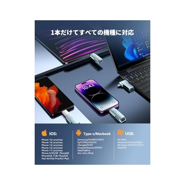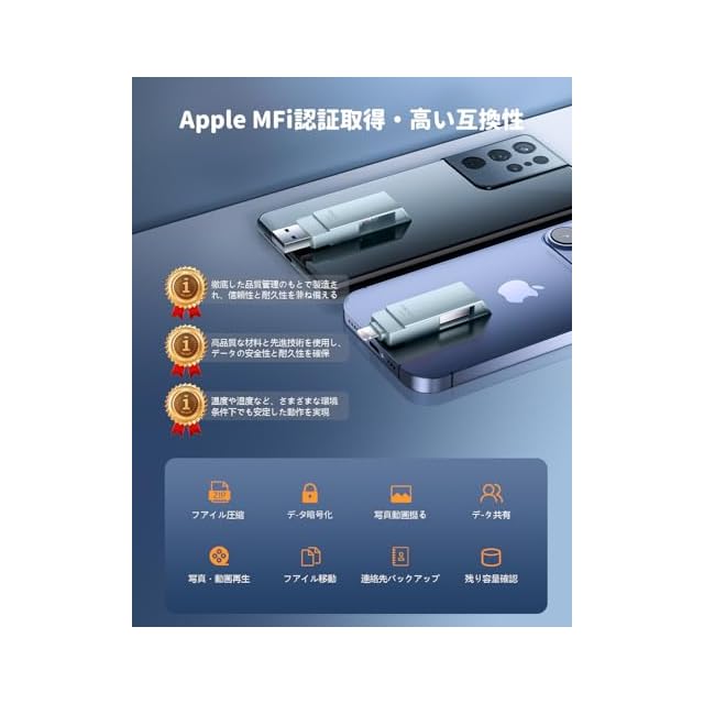 ✔【Apple MFi認証取得・高い互換性】iPhone 用USBメモリでは、アップルが設けた認証プログラム Apple MFi が認定されております。これアイフォン バックアップはアップルより提供されたライトニングコネクタを使って、アップルのサポートを受けて作成された周辺機器です。なので、すべてのiPhoneおよびiPadシリーズと互換性があります。iPhone 14 /14 Pro/13 Pro Max/13 mini/ 12 /12 Pro/12 Pro Max/12 mini/ 11 /11 Pro/11 Pro Max / SE/X /XS/XS Max /XR/8 Plus/8 / 7 Plus/7 /6s Plus/6s/6 6 Plus /iPad Air iPad(第9/8/7/6/5世代)iPad mini(第6/5/4/3世代)10.5インチiPad Pro 9.7インチiPad Pro / iPod touch 6/7/ MacBook Air/Macbook Pro/ iMac/PC /ノートパソコンなどのデバイスに対応します。