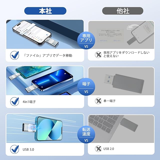 【高い互換性】本iPhone対応USBメモリーはすべてのPhone、iPadシリーズに対応いたします。Type-Cアダプターも付属しておりますので、Type-CコネクタのiPad、Phone、MacBookとも互換性があります。Phone 15 Pro Max/15 Pro/15 Plus/15/14 Pro Max/14 Pro/14 Plus/14/SE 3/13 Pro Max/13 Pro /13/13 mini /12 Pro Max/12 Pro/12 /SE 2 /11 Pro Max/11 Pro/11 /XR/XS Max/XS /X /8 Plus/8/7 Plus/7/SE 1/6s Plus /6s/6 Plus/6/ iPad Pro(第1/2/3/4/5/6世代)/ iPad Air(第1/2/3/4/5世代)/ MacBook(Pro/Air)/ iPad mini(第1/2/3/4/5世代)/ iPad(第5/6/7/8/9/10世代)/ PC /ノートパソコン/ Type-Cスマホ/ タブレットなどと互換性があります。