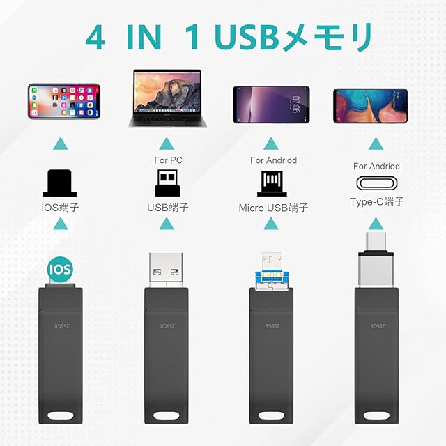 256GB Phone対応usbメモリ【専用アプリのパフォーマンスがより安定】 写真保存 直接usbに写真を移す4in1 フラッシュドラメモリAndroid パソコン対応 USBメモリ phoneの写真 を パソコン に 取り込む 容量不足解消