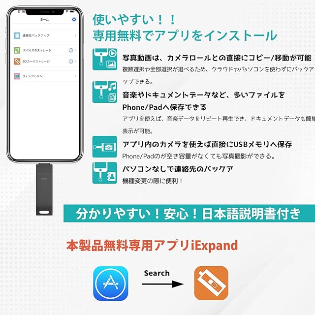 【品質3年・専門スタッフによる日本語対応】 phone 外 付け usb は十数通りの検査手順で逸品を確保,usbメモリはセイコー級 構造最適化で長持ち。人気のusb phoneランキングは1年間の品質購入後1ヶ月以内に、故障したUSBの交換に対応します。日本語取扱説明書と迅速対応のサポートサービスがあります。日本国内でのカスタマーサービスによって、スムーズな問題解決ができるようになっております。説明書内に連絡先を記載しておりますので、どうぞご連絡ください。