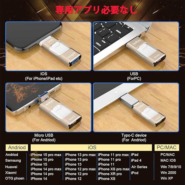 【多機種対応】 USBメモリ にはiOS、USB、type-c、micro USBの機種の接続タイプが4種も使用出来るので、PC/Android/MacBook/iOSで簡単にデータ バックアップです。 usbメモリはPhone 15 Pro Max/15 Pro/15 Plus/15/14 Pro Max/14 Pro/14 Plus/14/SE 3/13 Pro Max/13 Pro /13/13 mini /12 Pro Max/12 Pro/12 /SE 2 /11 Pro Max/11 Pro/11 /XR/XS Max/XS /X /8 Plus/8/i Pad Air(第1/2/3世代)/ MacBook(Pro/Air)/iPad mini(第1/2/3/4/5世代)/i Pad(第5/6/7/8/9世代)全シリーズ/ パソコン/ Type-Cスマホ/ Androidスマホ /タブレットなどとデータ移行 互換性のあるusbメモリ。