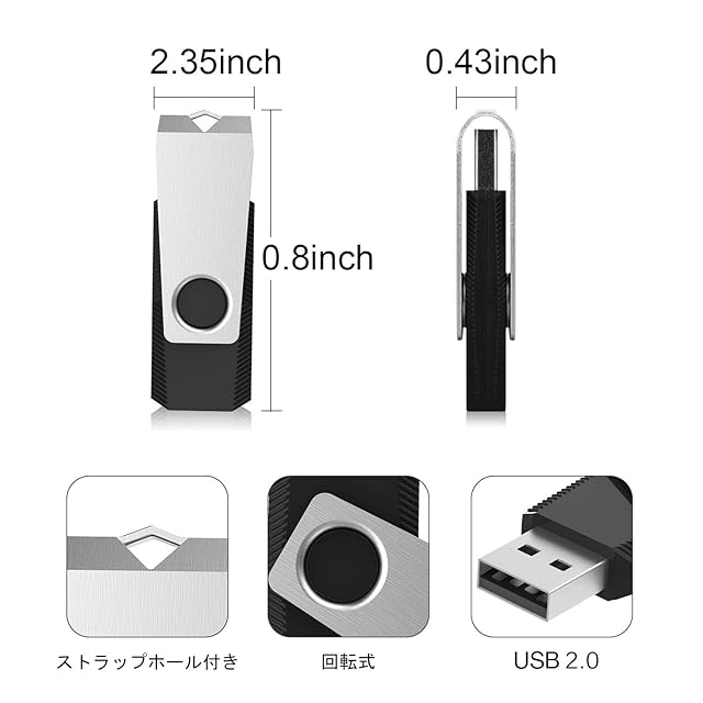 RAOYI USBメモリ 8GB USB 2.0 50個セット フラッシュドライブ 回転式 まとめ買い 業務用 メモリスティック 問屋 ストラップホール付き (黒)