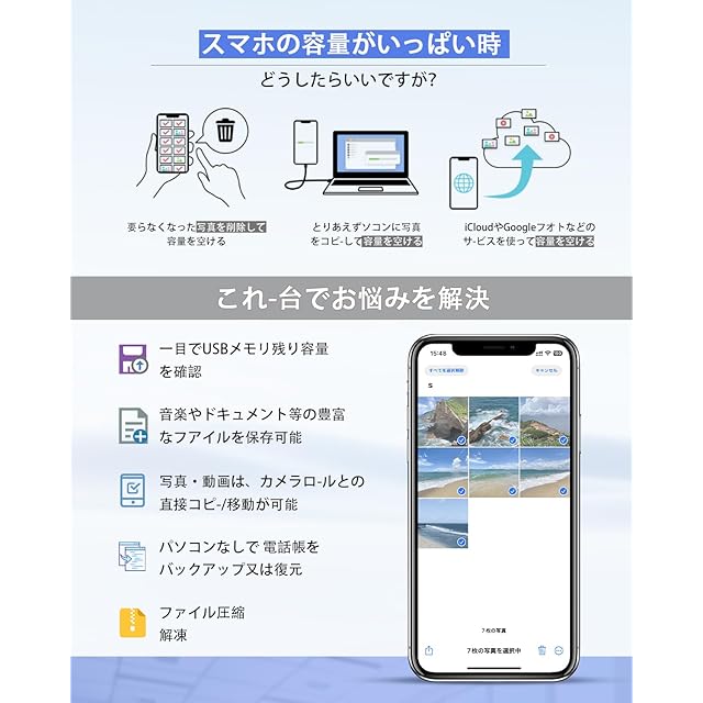 【簡単に操作・多機能実現】初心者でも簡単に利用できる多機能なデータ管理。シンプルな操作でデータをバックアップし、整理します。撮影した画像・動画データだけでなく、PDF/Excelファイルなども開いて確認できます。さらに、連絡先のバックアップおよび復元もおこなえるため、機種変更時、買い替え時などにも便利です。大容量でたくさんのデータを保存可能。インターネット環境やパソコンがない場所でも簡単にデータ容量を確保できます。