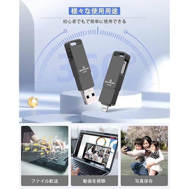 【高耐久性・24ヶ月間品質】アイフォン用 usbメモリ本体は高級感のある亜鉛合金製であるため、耐久性と安定性に優れています。360°回転保護キャップデザインにより、キャップの紛失を防ぎ、90°スタックします。ポイント設計により、ドライブがランダムに回転することを回避します。ハンギングリングを使用して、サムドライブUSBCをキーチェーンに掛けることができます。こちらの24ヶ月間の品質と購入後の3ヶ月内で初期不良の交換サービスを行っております。ご安心してご購入頂けます。