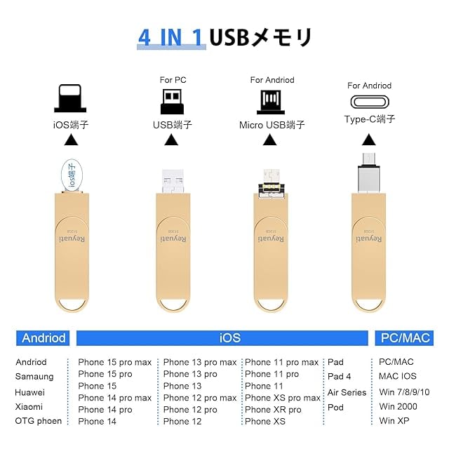 【アプリ不要・令和7年限定版 】512GB usbメモリ 写真保存 直接usbに写真を移す4in1 フラッシュドラメモリ IOS Android PC 人気 USB 両面挿しスマホ USB メモリー iPad USB Phone対応 フラッシュドライブ Android パソコン対応 アイフォン用 USBメモリ phoneの写真 を パソコン に 取り込む 容量不足解消(512GB-ゴールド)