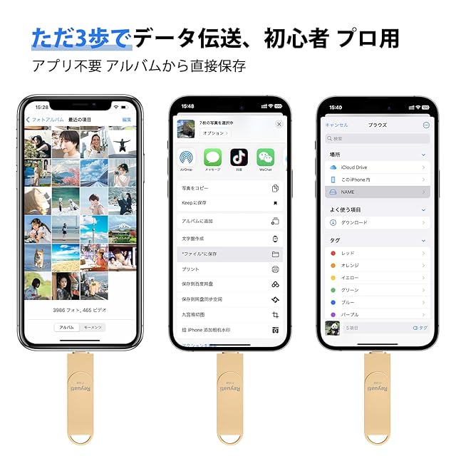 【4in1 多機種対応・専用アプリ必要なし、安心安全usbメモリ】当社のusbメモリは専用アプリ必要なくて、Ap社の「ファイル」を使用して、phone データ直接保存可能です。他社の専用アプリ必要usbメモリに比べて、アプリのダウンロードの邪魔がなくて、phone・iPadのデータが直接バックアップ可能、もっと便利、安心安全!さらに、IOS・USB-A・USB-C端子が4 IN 1で、幅広いデバイスを対応可能で、データ転送、phone・iPad容量不足、簡単に解消出来ます。