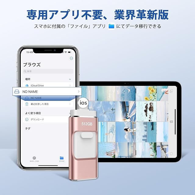 【専用アプリ不要、全面的にアップグレード!】専用アプリをダウンロードしないと使えない?最新技術でアップグレードされた新版のiPhone対応USBメモリは、専用アプリをダウンロードせずにデータを移行できて、専用アプリから解放します。USBメモリーをスマホに挿入するだけで、写真や動画などをスマホのアルバムからUSBメモリに保存できて、スマホに付属している「ファイル」アプリではUSBメモリーに保存されているデータを確認できます。
