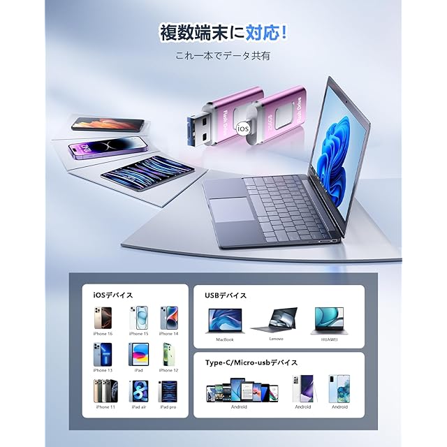 【多機種対応・互換性が抜群】アイフォンバックアップはほぼすべてのiOSシリーズと互換性があります。USB-Cコネクタを搭載したMacbook、Androidとも互換性があります。Phone 15 /15 Pro/Phone 14 /14 Pro/13 Pro Max/13 mini/ 12 /12 Pro/12 Pro Max/12 mini/ 11 /11 Pro/11 Pro Max / SE/X /XS/XS Max /XR/8 Plus/8 / 7 Plus/7 /6s Plus/6s/6 6 Plus /iPad Air iPad(第9/8/7/6/5世代)Pad mini(第6/5/4/3世代)/ MacBook Air/Macbook Pro/ iMac/PC /ノートパソコン/Androidスマホ(OTG機能付き)などのデバイスに対応します。