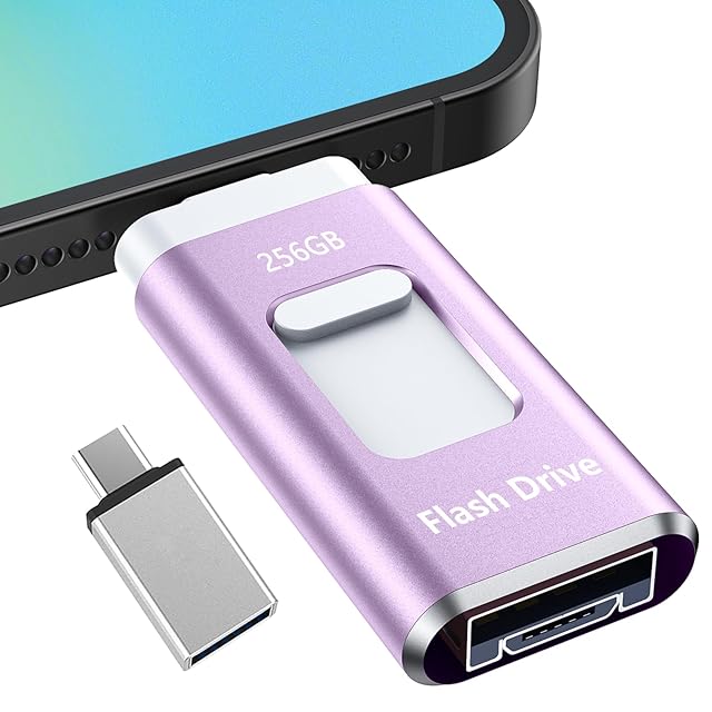 【専用アプリ不要 アルバム整理簡単】Phone用USBメモリ 4in1 USBメモリ256GB phone用外付けメモリ 高速USB3.0 タイプc usbメモリー IOS/Android/PC/Macに対応 phone兼用 バックアップ アプリ不要 スマホ usbメモリ phone 写真データ保存 スマホ容量不足解消 写真画像撮り放題(パープル)