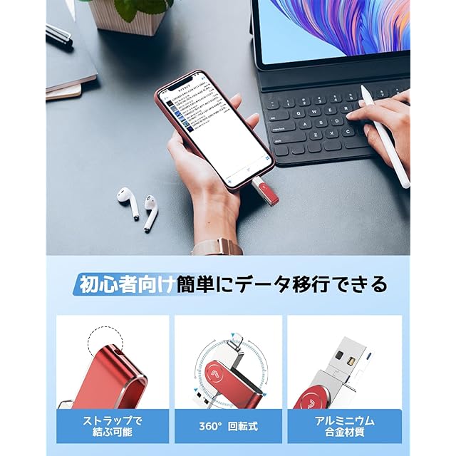 【容量不足解消・日本語取扱説明書付】スマホやPadなどに保存される写真や動画が増えているため、容量はいっぱいになって、iCloudストレージも上限に達し、スマホはフリーズしやすくなって、今は256GBのiPhone対応USBメモリーを使用すると、スマホの写真、動画などのデータを削除せずにUSBメモリに移行できて、スマホの容量を軽くすることができます。本製品には日本語取扱説明書が付属しており、USBメモリ中にも日本語取扱説明書のPDFファイルがあるので、シンプルで操作が分かりやすいです。