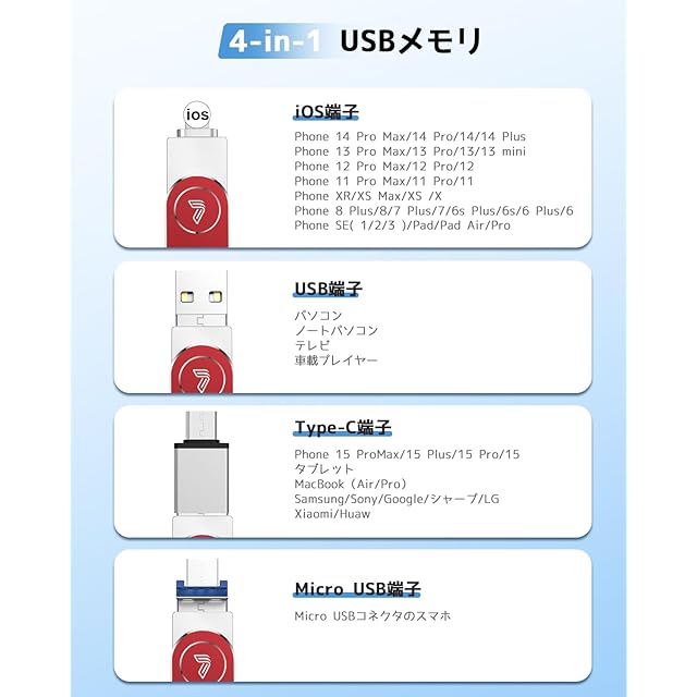 【4in1多機能・セキュリティ機能付】USBメモリはライトニング、Type-C(USB-C)、USB(USB-A)、Micro USBの4つのコネクタを搭載し、iOS機種、パソコン、Type-Cスマホ、Macbookなどに対応します。iPhone対応USBメモリを一個使用するだけで、異なる機種の間でデータ移行・保存ができます。USBメモリは、データバックアップ、ファイル移動、データ管理、データ共有、ファイル圧縮、データ暗号化、連絡先バックアップや写真・動画撮るなどの機能で構成され、普通のUSBメモリと比べて、著しい進歩を遂げています。USBメモリ内のデータはパスワードかけれるので、データ漏洩を効果的に防止できます。(ご注意:スマホとパソコンのシステムが異なるため、暗号化されたデータはパソコン上で見ることができなく、セキュリティ機能はiOS機種でしか使用できず、他の機種ではサポートされていませんので、予めご了承ください。)