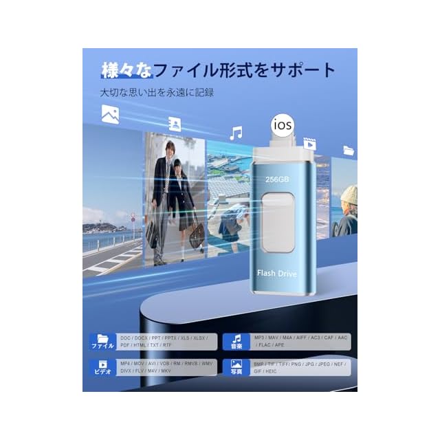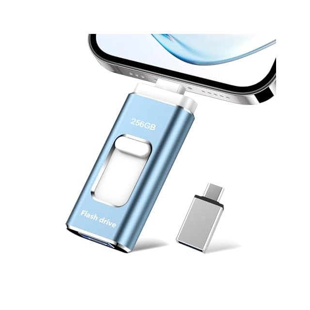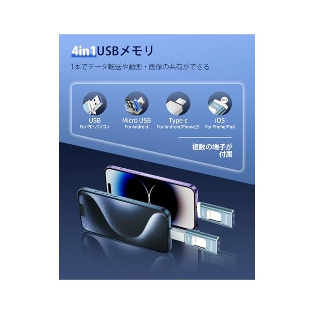 256GB USBメモリー【アプリ不要】4in1 phone対応usbメモリ高速USB 3.0 IOS/USB/Type-C/micro usb フラッシュメモリ type-c USB メモリーphoneデータ 転送保存 写真 バックアップアイフォン用 外付けメモリIOS/Android/Win/MAC対応 携帯容量不足解消(ライトブルー)