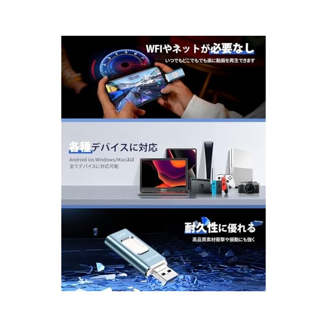 【高い互換性】本iPhone対応USBメモリーはすべてのPhone、iPadシリーズに対応いたします。Type-Cアダプターも付属しておりますので、Type-CコネクタのiPad、Phone、MacBookとも互換性があります。Phone16/ 15 Pro Max/15 Pro/15 Plus/15/14 Pro Max/14 Pro/14 Plus/14/SE 3/13 Pro Max/13 Pro /13/13 mini /12 Pro Max/12 Pro/12 /SE 2 /11 Pro Max/11 Pro/11 /XR/XS Max/XS /X /8 Plus/8/7 Plus/7/SE 1/6s Plus /6s/6 Plus/6/ iPad Pro(第1/2/3/4/5/6世代)/ iPad Air(第1/2/3/4/5世代)/ MacBook(Pro/Air)/ iPad mini(第1/2/3/4/5世代)/ iPad(第5/6/7/8/9/10世代)/ PC /ノートパソコン/ Type-Cスマホ/ タブレットなどと互換性があります。