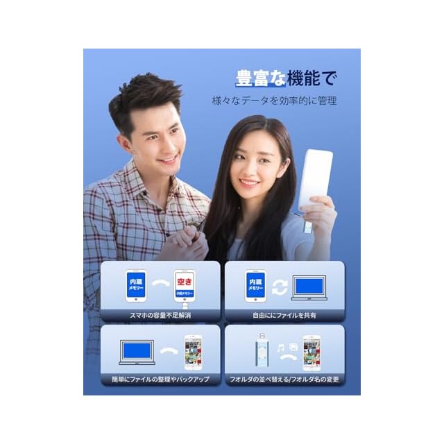 【簡単データ管理・容量不足解消】 phone用外付けメモリシンプルで使いやすいデザインと、初心者でも簡単に操作できます。プラグアンドプレイの機能で、手間がかからず、スムーズなデータ移行が可能です。写真、ビデオ、音楽、ドキュメントなどのファイルを効率的に整理し、管理することができます。データの整理とバックアップを一括で行い、ストレスを軽減しましょう。スマホ/タブレットに容量不足をすぐに解決できます。PCいらずでも空き容量を確保できます。