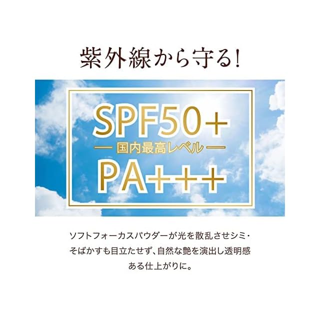 国内最高レベルSPF50+/PA+++:ソフトフォーカスパウダーが光を散乱させ、シミ・そばかすも目立たせず、自然な艶を演出し、透明感ある仕上がり。