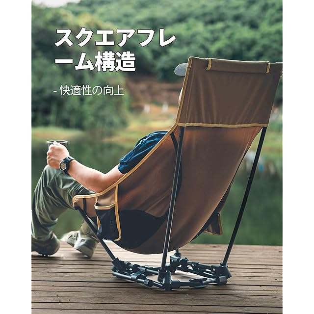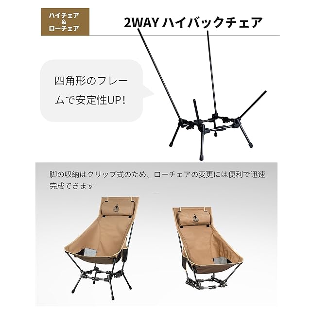 【四角フレーム・安定性UP】このハイバックチェアは四角形フレーム構造により、安定性を確保しつつ、シートバックを高くすることができます。耐荷重は150kgとともに、滑り止め付きチェア足で地形へ対応しやすく、使用する際の安心感を高めます