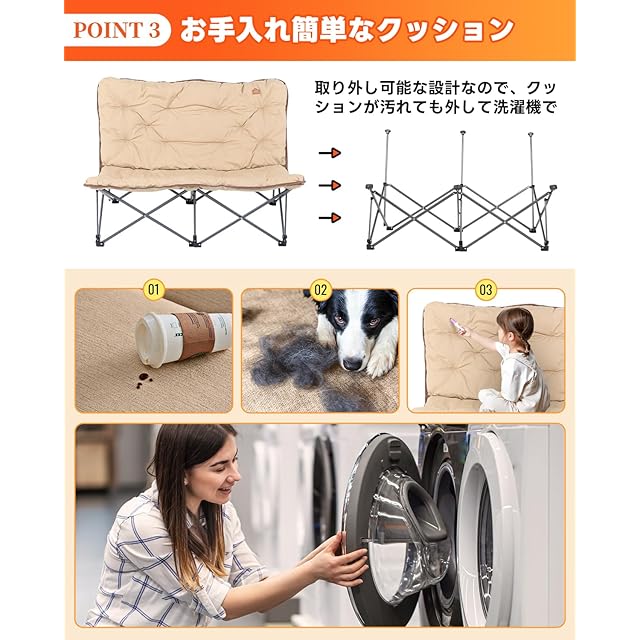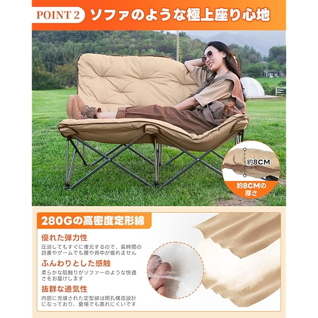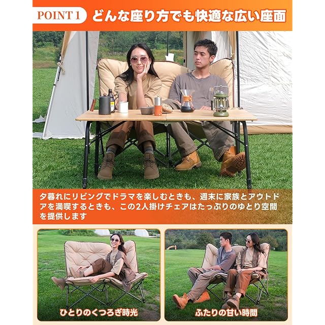 【どんな座り方でも快適な広い座面】夕暮れにリビングでドラマを楽しむときも、週末に家族とアウトドアを満喫するときも、この2人掛けチェアはたっぷりのゆとり空間を提供します。129cmの広々とした座面なら、一人で足を組んだり横になったりしてくつろぐのはもちろん、二人並んで座っても窮屈さを感じません。恋人と寄り添って夕日を眺めたり、友人とお菓子を分け合いながらおしゃべりしたり、子供に寄りかかって絵本を読んであげたり……いつだって心地よい時間が過ごせます。
