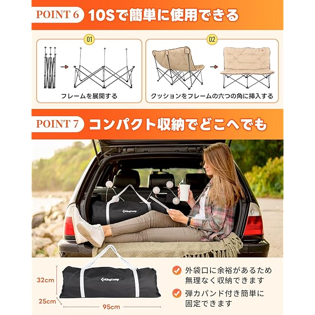【10Sで簡単に使用できる】この二人掛けチェアは、フレームを展開してクッションをフレームに挿入するだけで即座に使用可能です。キャンプ場に着いたら、サッと広げてすぐに休憩できます。時間も手間もかからず、思い立ったその瞬間からくつろぎタイムが始まります。