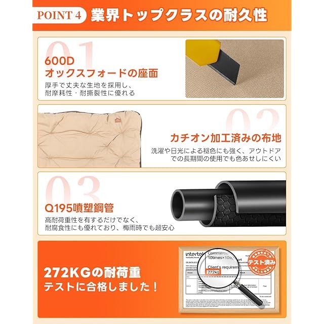 【業界トップクラスの耐久性と安定性・耐荷重272kg】①座面にはカチオン加工の600Dオックスフォード生地を採用しました。オックスフォード生地本来の耐摩耗性・耐撕裂性に加え、カチオン加工により洗濯や日光による褪色にも強く、アウトドアでの長期間の使用でも色あせしにくいのが特徴です。②高強度Q195鋼管フレームに粉体塗装を施すことで、優れた強度と耐腐食性を実現できます。③様々な地形に対応する大型滑り止めキャップ付きで、砂浜や傾斜地でも安定感抜群です。