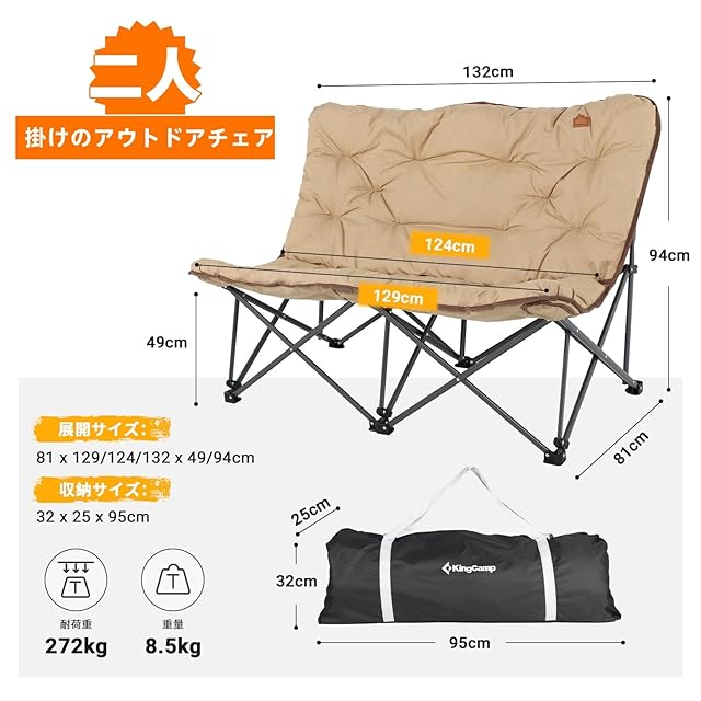 KingCamp アウトドア チェア 2人掛け キャンプ 椅子 折りたたみ 極上座り心地 ふかふかクッション 耐荷重272kg 簡単組立 収納バッグ付き ソファチェア バタフライチェア 室外 室内 ベランダ 庭