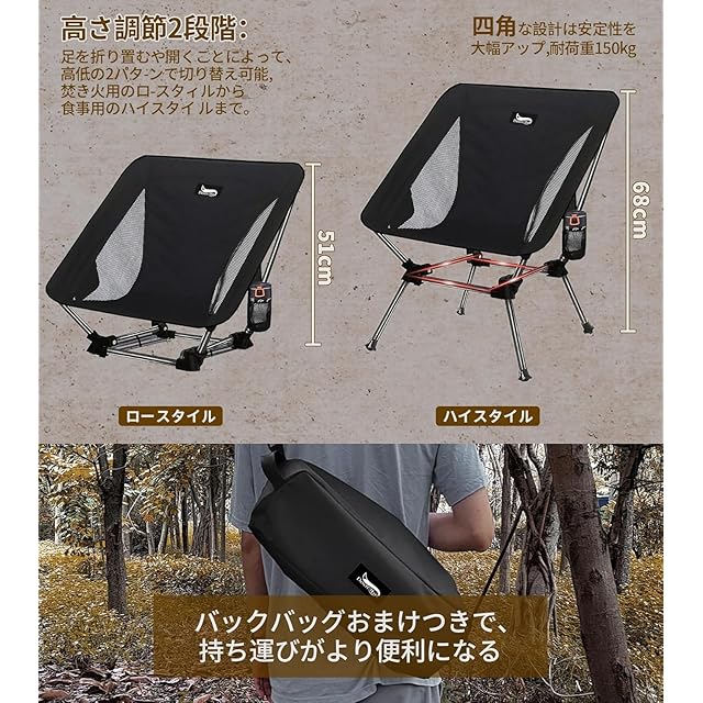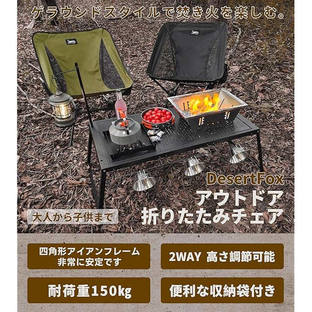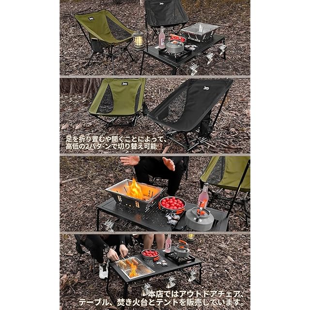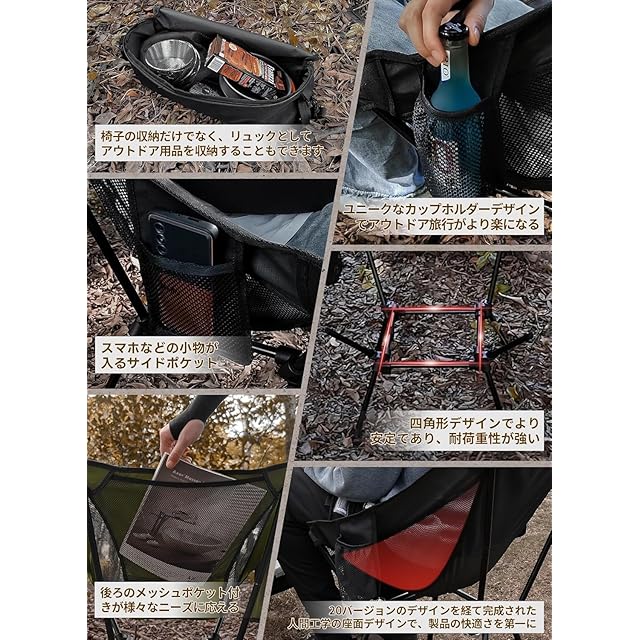 ✅【高さ両パターンで切り替え可能】足を折り畳むや開くことによって、グランドとノーマルスタイルの両パターンで切り替え可能。焚き火に近づき暖まることや、足を伸ばすことができ、より多くのシーンで大活躍!✅【四角形フレームでより安定】伝統的なキャンプ椅子と違い、座面の下のフレームは四角形となっていて、全体的に安定性がアップグレード!