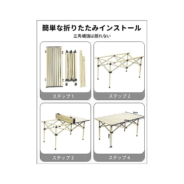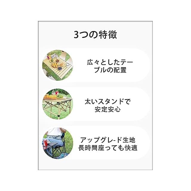 軽量で持ち運びやすい:折りたたみテーブル&チェアセットは、軽量設計で持ち運びや収納が簡単です。折りたたむとコンパクトになり、携帯用バッグも付属しているため、いつでもどこでも屋外活動を楽しむことができます。バーベキューやキャンピングカー旅行、アウトドアでの食事にも便利です