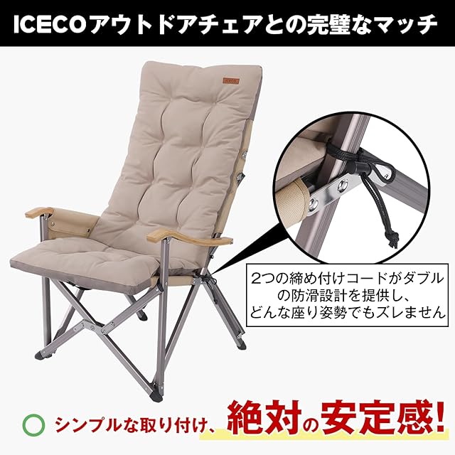 ICECO アウトドアチェアクッションカバーが好評発売中!:被せるだけで簡単に取り付けできます。両側には締め付けコードがあり、ダブルの防滑設計が施されており、クッションカバーをICECOのアウトドアチェアにぴったりフィットし、姿勢を調整してもズレません。最高の包み込まれる快適さをお楽しみください。