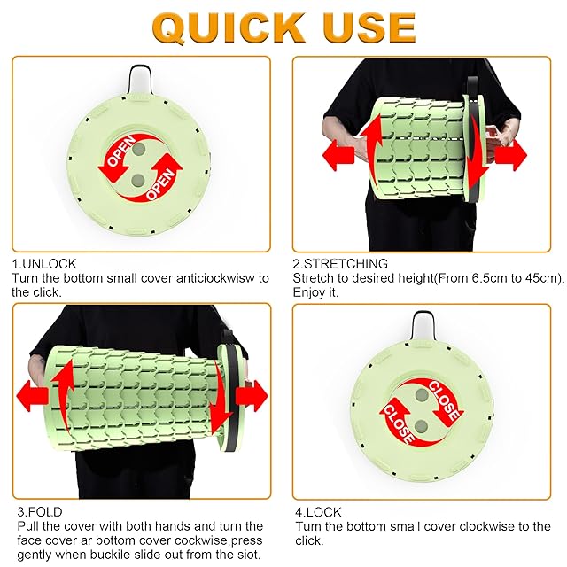 【使い方超簡単・耐荷重270KG】●収納するときは逆方向に少しひねりを入れながらスツールの両端を押すだけで一瞬で収納可能。●伸縮式チェア本体は1kgしかないにもかかわらず、頑丈なABSとポリアミドを採用したので、最大荷重は270kgにも達しています。軽量で携帯しやすくて、構造も安定しています。