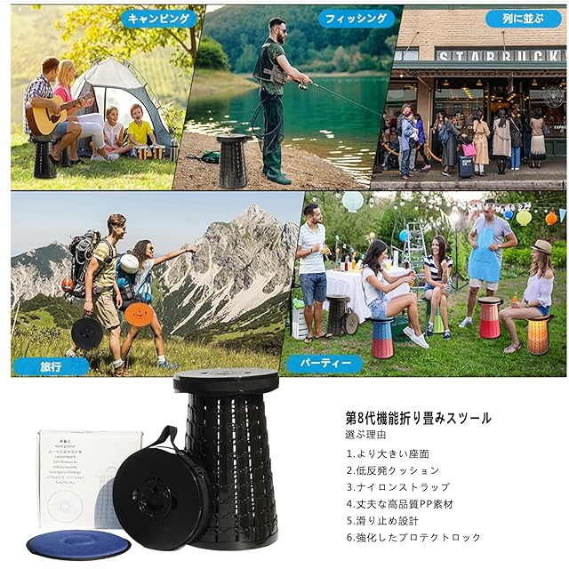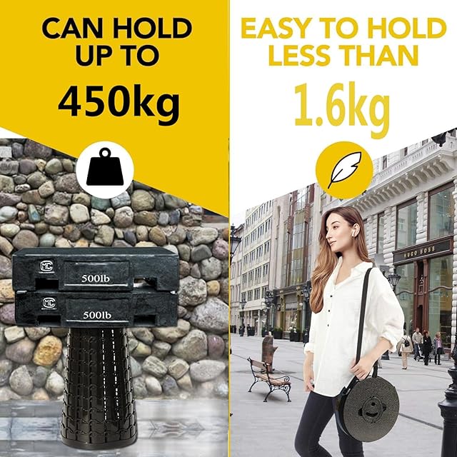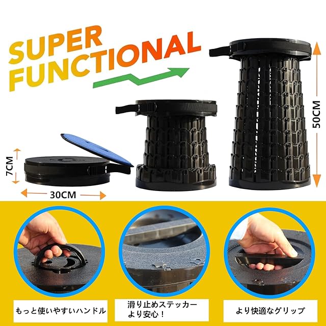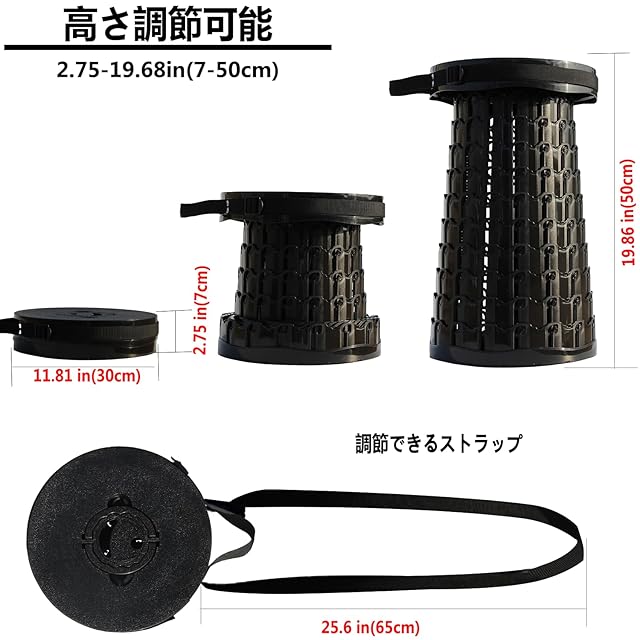 【軽量・コンパクト・耐荷重200kg】:伸縮式チェア本体は1kgしかないにもかかわらず、頑丈なABSとポリアミドを採用しており、最大荷重は200kgにも達しています。滑りにくさを追求した特殊デザインの底部を採用し、滑り止めので安全性を高めています。頑丈で環境にやさしいプラスチックPA + ABSを採用することにより強度が強くなり、軽量で携帯しやすくて、構造も安定しています。