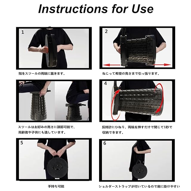 【伸縮式スツール・折畳可能・一秒開閉】:この折り畳み椅子は一瞬で引き出せる、持ち運びに非常に便利です。使用するときは、少しひねりながら両端を引いて1秒だけで折りたたみ椅子が完成です。収納するときは、逆方向に少しひねりながら両端を押すだけで収納できます。折り畳むと厚さがわずか6.5cmになり、収納バッグが付いておりますので、楽に持ち運びができます。商品詳細:折り畳み椅子+クッション+収納バッグ+カラビナ