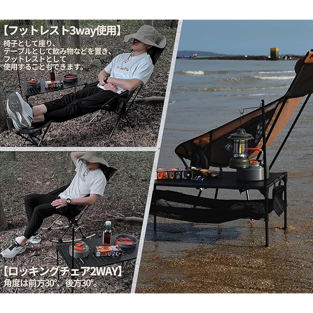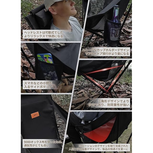 【優れる耐久性と通気性】 アウトドア椅子は800Dポリエステルを採用した座面とメッシュの設計で、あつい季節も蒸し暑くなく、抜群の通気性と快適な座り心地を確保できます。座面の裏も防水加工し、雨でもタオルでちょっと拭くだけ座れます。さらに、座面を深くするし、ハンモックのように体にフィットし、ゆったりと包み込まれる座り心地を実現したレジャーチェアです。
