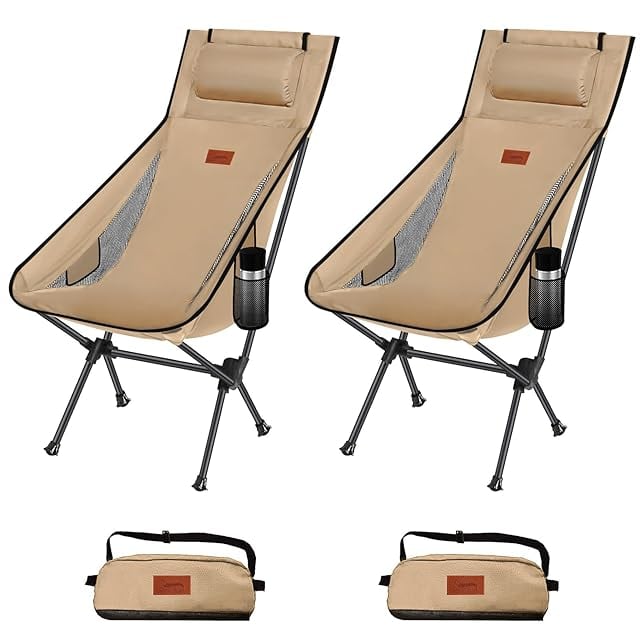 DesertFox アウトドアチェア 折りたたみ 枕付き 超軽量 2個セット【独自開発のカップホルダー】 【耐荷重150kg】 キャンプ椅子 コンパクト イス ハイバック 椅子 収納袋付属 お釣り 登山 携帯便利 2088 (カーキ,スタイルA)