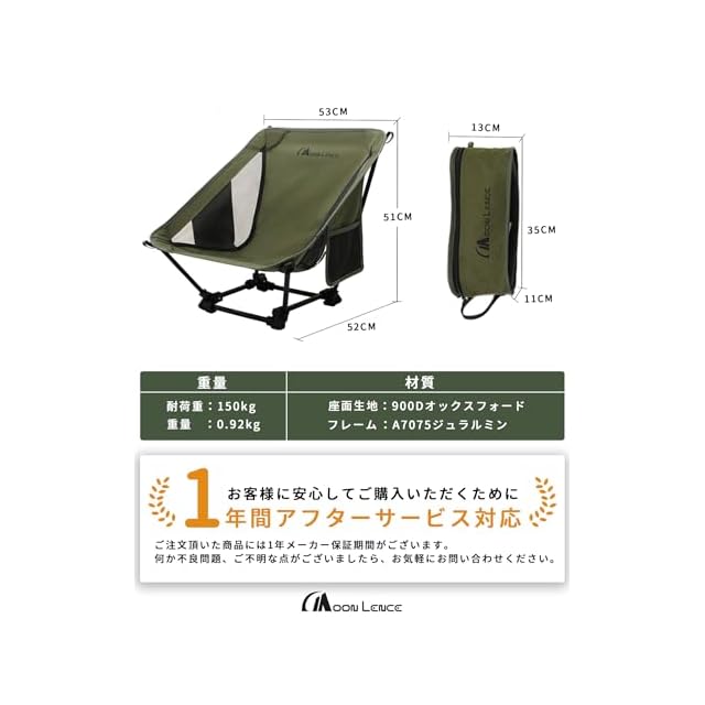 ✿【アウトドアチェア仕様】重量:0.92kg / 使用時のサイズ:53*52*51cm / 収納袋のサイズ:35*13*11cm (測量方法により、若干の誤差が出る可能性があります。ご了承ください。) / 座面生地:900Dオックスフォード / フレーム:A7075ジュラルミン / 耐荷重:150kg