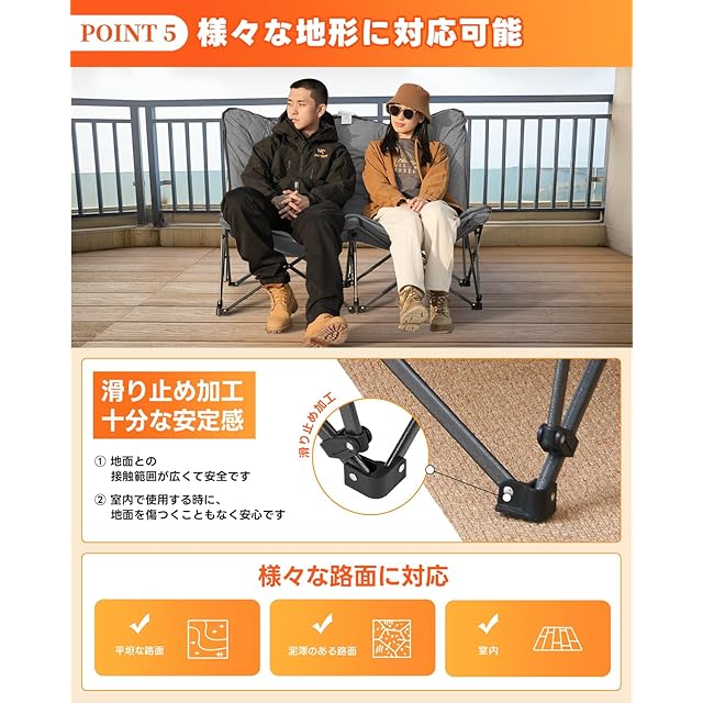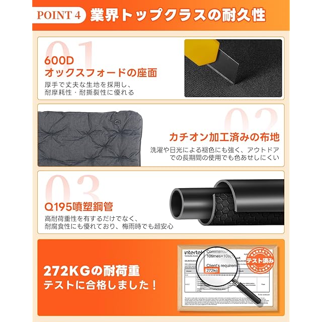 【業界トップクラスの耐久性と安定性・耐荷重272kg】①座面にはカチオン加工の600Dオックスフォード生地を採用しました。オックスフォード生地本来の耐摩耗性・耐撕裂性に加え、カチオン加工により洗濯や日光による褪色にも強く、アウトドアでの長期間の使用でも色あせしにくいのが特徴です。②高強度Q195鋼管フレームに粉体塗装を施すことで、優れた強度と耐腐食性を実現できます。③様々な地形に対応する大型滑り止めキャップ付きで、砂浜や傾斜地でも安定感抜群です。