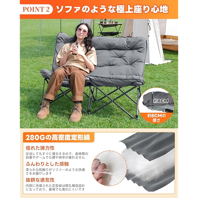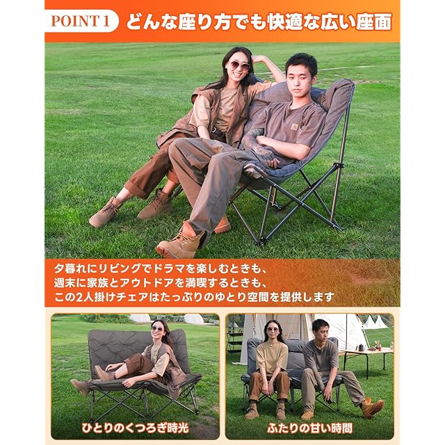 【どんな座り方でも快適な広い座面】夕暮れにリビングでドラマを楽しむときも、週末に家族とアウトドアを満喫するときも、この2人掛けチェアはたっぷりのゆとり空間を提供します。129cmの広々とした座面なら、一人で足を組んだり横になったりしてくつろぐのはもちろん、二人並んで座っても窮屈さを感じません。恋人と寄り添って夕日を眺めたり、友人とお菓子を分け合いながらおしゃべりしたり、子供に寄りかかって絵本を読んであげたり……いつだって心地よい時間が過ごせます。