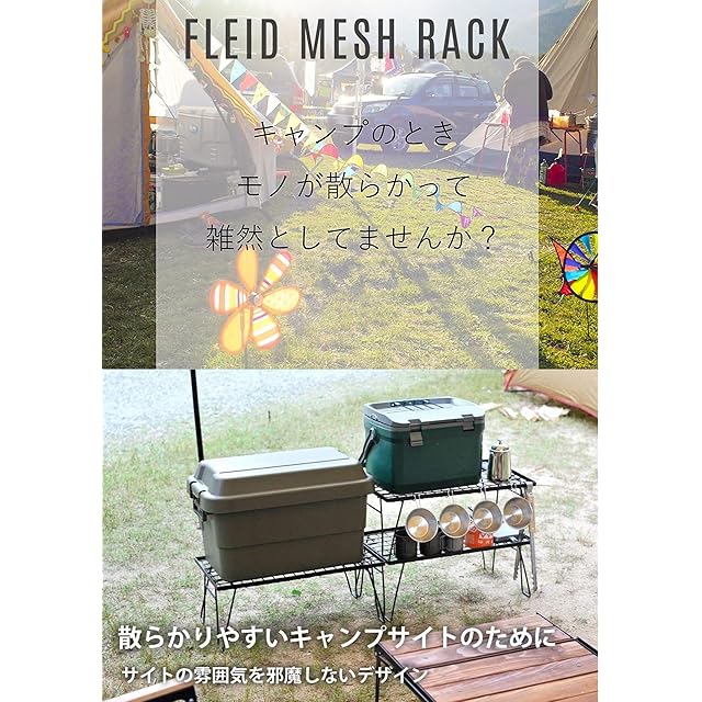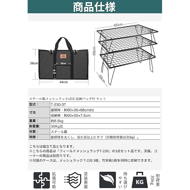 【キャンプサイトのレイアウトに】サイトの雰囲気を邪魔しないデザイン。テーブルとして使用するもにもちょっといい大きさ。オプション(別売品)が豊富で、連結天板でさまざまなレイアウトに対応。ソロキャンプでのテーブルとして、焚き火のサイドテーブルとしてなど、アイデア次第どんな使い方も可能です。【ある時はラック、ある時はテーブルと、マルチに使える】ギアボックスや小物類を置くのに便利で、2段重ねにすれば、上段に2バーナー、下段に調理器具や食材をおいて、ロースタイルのキッチンカウンターとしても使えます。ロースタイルなキッチンシステムとしても使える。<br> 【クーラーBOXスタンド】クーラーボックスなど地面への直置きに抵抗のあるアイテムの頼まれるスタンド。雨の日、雨水がタープやスクリーンの中まで流れる事もしばしば。そのような場面で濡らしたくないものを置いておけるクーラーボックススタンド。シンプルな構造で簡単に組手折りたたみができます。メッシュなので、洗った食器をそのまま置いて乾かすこともでき、食器類の水切り、乾燥にも便利な水切りラックにも。別売品のメッシュバックT-2303を取り付けると、虫除けにも