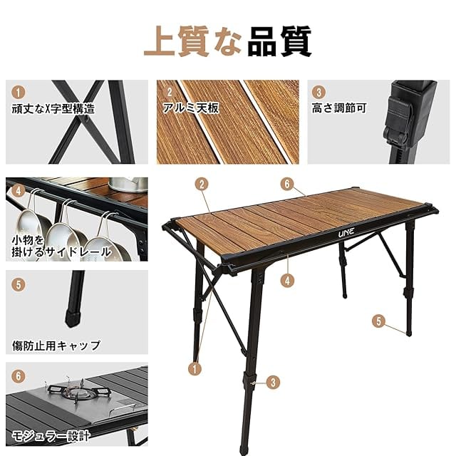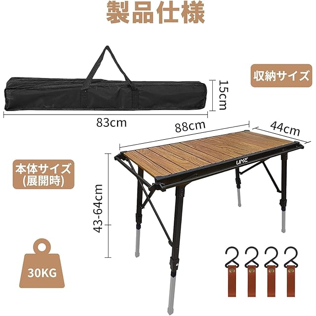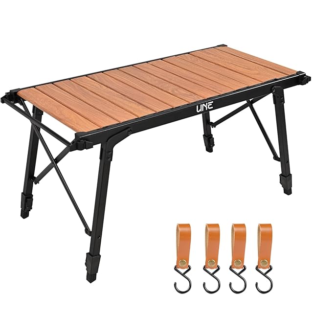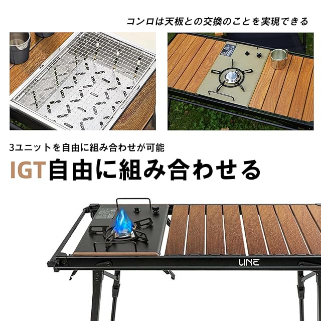 UNE igt テーブル 4個フック付き 茶色 ソロツアーテーブル 軽量 折り畳み キャンプ用 igt対応 高さ43~64cm調節可能 吊り下げ用サイドレール付き キャンプ用 机 コンパクト 3ユニットアルミ天板 収納袋付き アウトドア/ハイキング/BBQ/ピクニック用