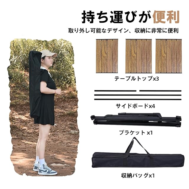 【軽量・持ち運びやすい】航空級アルミを採用した折りたたみ構造で、専用収納袋に収めると約 15cm×11cm×83cm のコンパクトサイズ。一体成型のメインテーブルは折りたたみが簡単、持ち運びや保管に負担がない。アウトドアキャンプ・ピクニック・車中泊にキャンプ用テーブルのおすすめです。