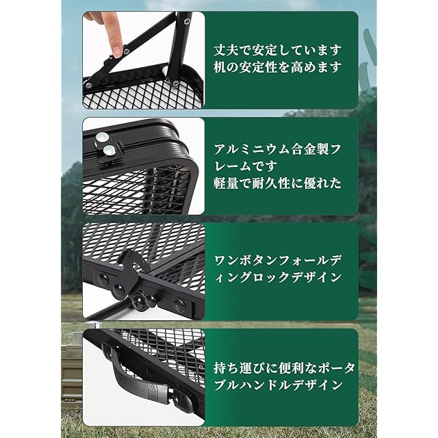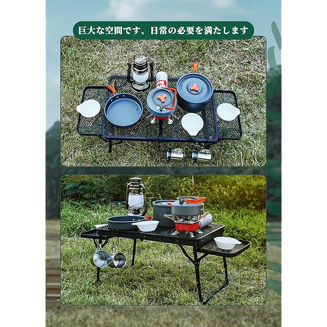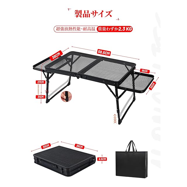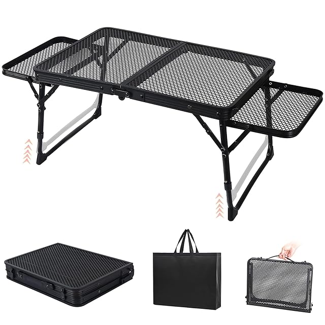 【2段階調整可能·コンパクト·折りたためる·大きなスペース】従来のキャンプテーブルと比較して、両側に2つの小さなテーブルボードを追加してスペースを増やし。高さも27cm/31cmで2段階で調整可能、さまざまな用途に合わせて高さを自由に変更できます。キャンピングテーブルは、アルミ合金製ブラケットと金網で作られ、軽量で耐久性が高い。キャンピングテーブルは黒い塗料で塗装され、軽さと耐久性を保ちながら、見た目の美しさもされている。