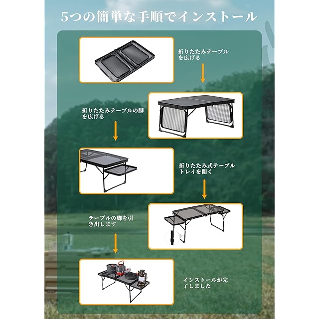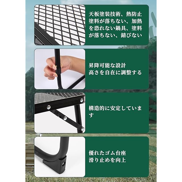 【多機能·組み立てが簡単】取り付けも取り外しも簡単、工具不要、5秒で取り付け完了。防水性と耐熱性に優れ、やかんやお皿などの熱いものを金網の上に直接置くことができます。 クーラースタンドや大型三脚、調理器具の水切りとしても使えます。テーブルトップは直火クッキングステーションとして使用できません。