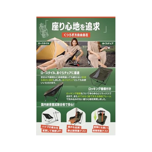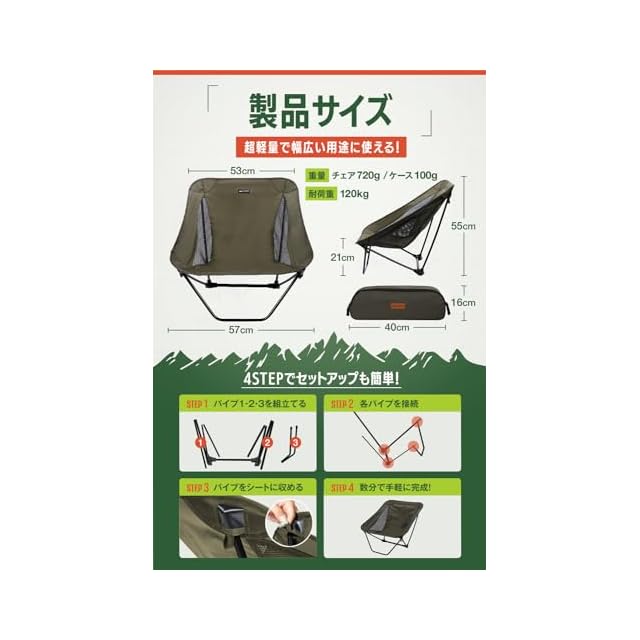 ◆【国内耐荷重試験合格】第三者評価機関カケンテストセンターにてJISs1203:1998区分4※1600N(150kg)に合格しました。※メーカー推奨は120kgとしています。◆【A7075超々ジュラルミンのフレーム】飛行機にも使用されているA7075超々ジュラルミンを採用しており、軽量で非常に強力なフレームになります。◆【製品サイズ】使用時63cm×57cm×55cm 収納サイズ:10cm×40cm×16cm 重量 チェア720g ケース100g