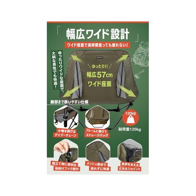 ◆【ワイド座面】一般的なコンパクトチェアは横幅が狭く窮屈に感じます。RiveRockのチェアは横幅57cmで大柄な男性でもゆったりご使用いただけます。◆【ローチェア】焚き火や調理など長時間座っても疲れない最適な高さの設計であぐらチェアとしてご使用いただけます。