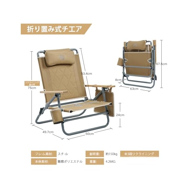 →【幅広い用途】キャンプチェア、焚き火チェア、ビーチチェア、ガーデンチェアなどとして、アウトドアで幅広くお使いいただけます。 同時に、リラックスチェアや昼休みのリクライニングチェアとして、自宅やオフィスでの室内使用にも適しています。