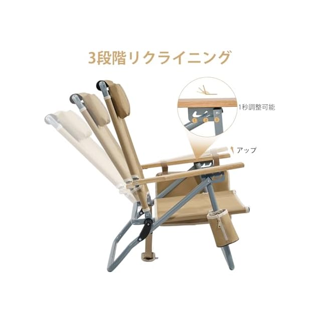 →【3段階リクライニング】:天然木制の肘掛を軽く持ち上げることで、折りたたみ椅子の背もたれをお好みの角度に調節できます。また、取り外し可能なヘッドレストも付いているので、昼休みや昼寝の際に頭と首を十分にリラックスさせます。