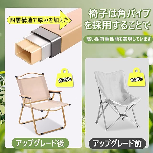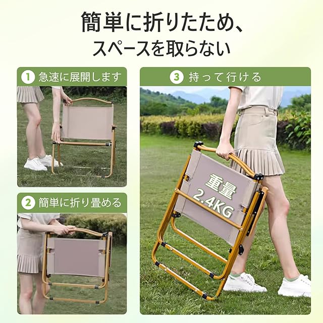 【超軽量&コンパクト折りたたみ設計】わずか約 2.5kg の軽量ボディと折りたたみ構造で、片手でも簡単に持ち運び可能。使用時サイズは幅 48.5cm× 奥行 51cm× 高 76cm で、150kg の耐荷重に対応。折りたたんだ状態はコンパクトなサイズで、車のトランクやキャンプバックパックにスムーズに収納でき、キャンプやハイキング、フェスなどの移動先ですぐに展開できるアウトドアチェアです。