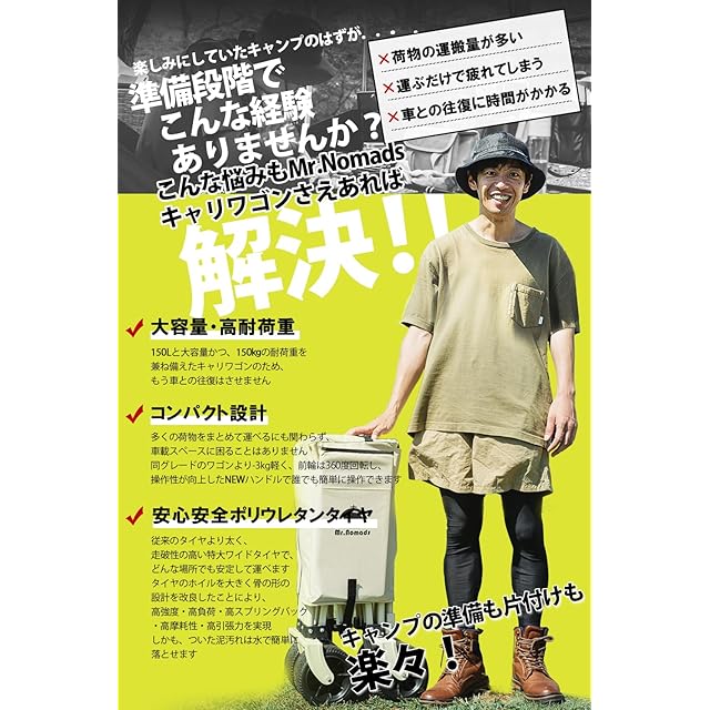 ✅【大量の荷物も一度で運べる】丈夫なフレームで驚きの大容量170L、耐荷重150kgを可能にしたキャリーワゴン。荷物が多くなりがちなアウトドアやキャンプでも、一度に大量の荷物をキャリーワゴンに載せてラクラクと運べるので疲れません。※耐荷重に関して、動的耐荷重120㎏以下をお勧めします。