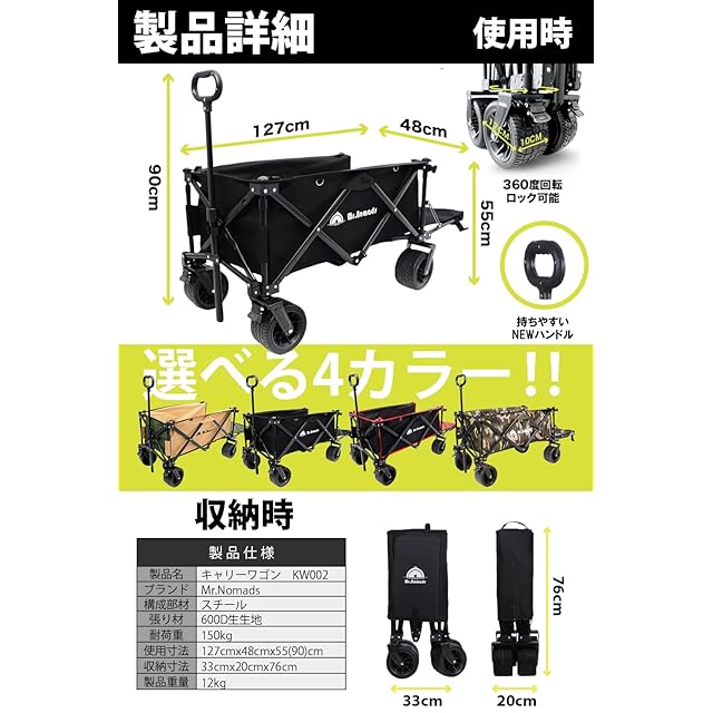 MR. NOMADS 【ラグビー日本代表使用】 キャリーワゴン キャリーカート 4輪 こども乗せれる 折り畳み 軽量 大容量 170L コンパクト 大きいタイヤ 頑丈 耐荷重150kg 自立収納 ワンタッチ収束式 アウトドアワゴン キャンプワゴン カート 子供 (KW002 Black Black) リアゲート付き