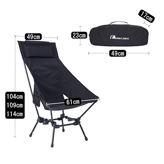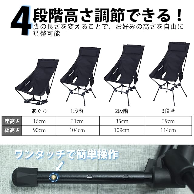 MOON LENCE アウトドアチェア ハイバック 四段階高さ調節 キャンプ 椅子 あぐらチェア グランドチェア 折りたたみ 軽量 コンパクト 枕付き 耐荷重180kg ブラック