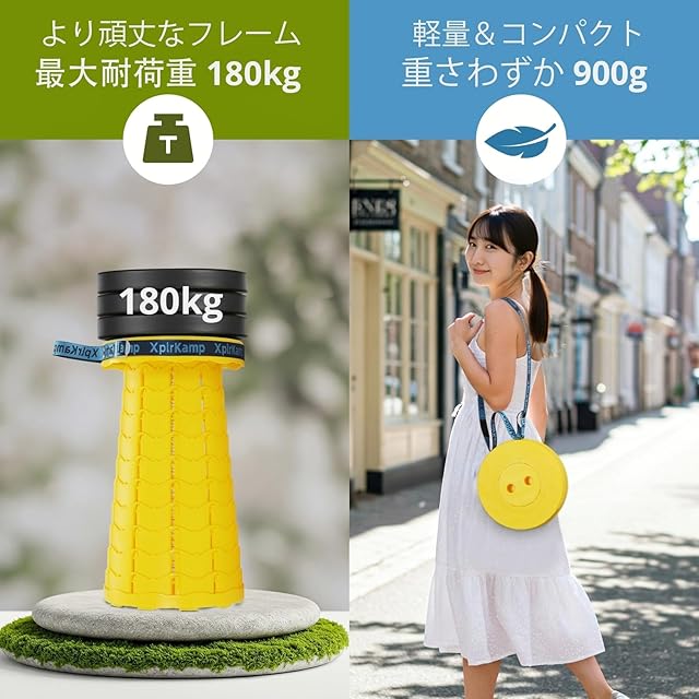 【超軽量0.9kg!持ち運び楽々】ペットボトル1本分の重量(900g)とコンパクト設計で、折りたたみ椅子として抜群の携帯性。付属の調整可能ショルダーベルト(最大56cm)で肩にかければ、キャンプやお花見はもちろん、通勤時の電車待ちや旅行先でも邪魔になりません。